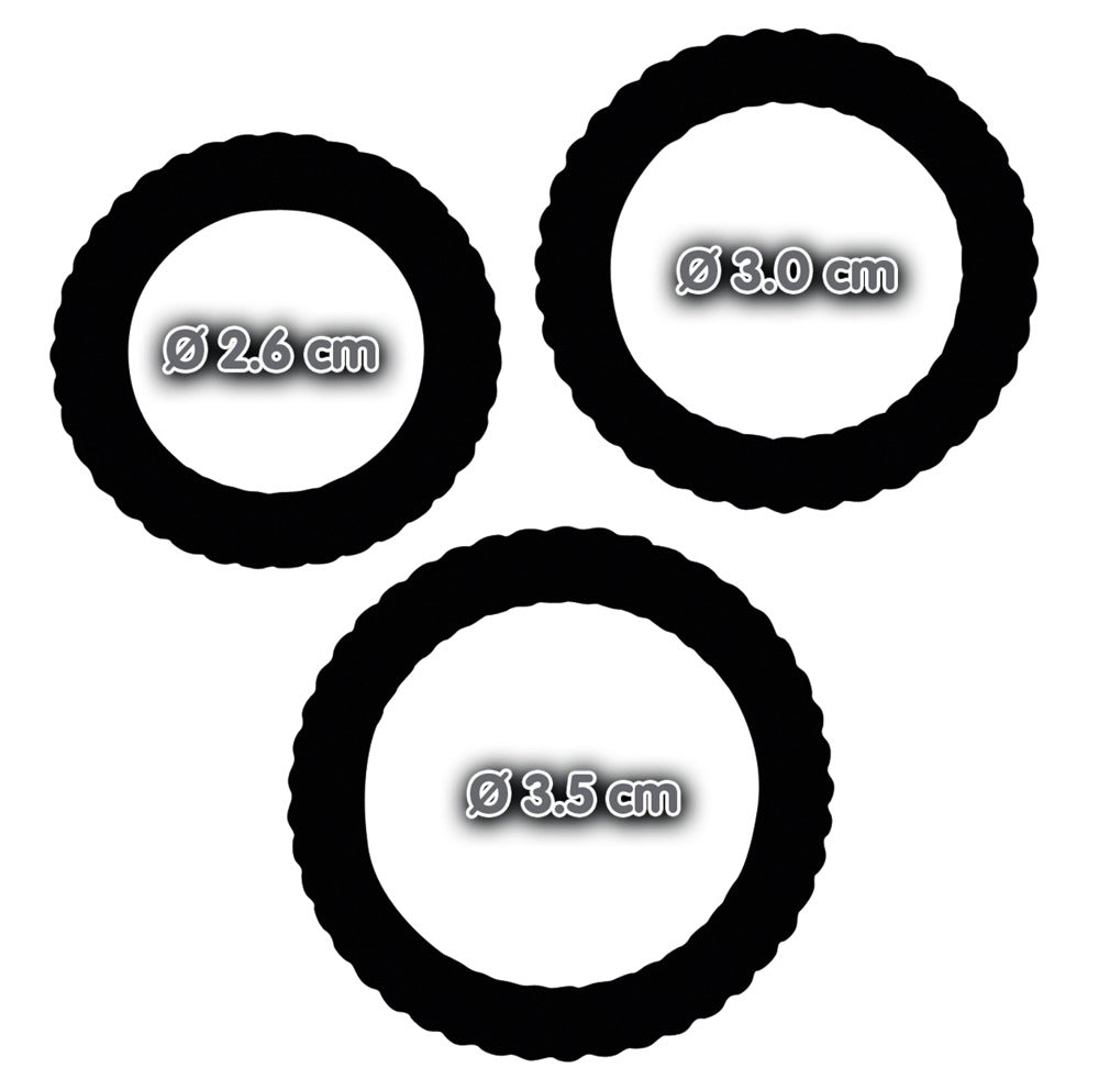 3 penis rings with grooved structure with different diameters (2.6, 3.0 and 3.5 cm). Also ideal for testicle lacing. Can be used individually or in combination. Material: silicone, phthalate-free according to EU Regulation 1907/2006/EC.